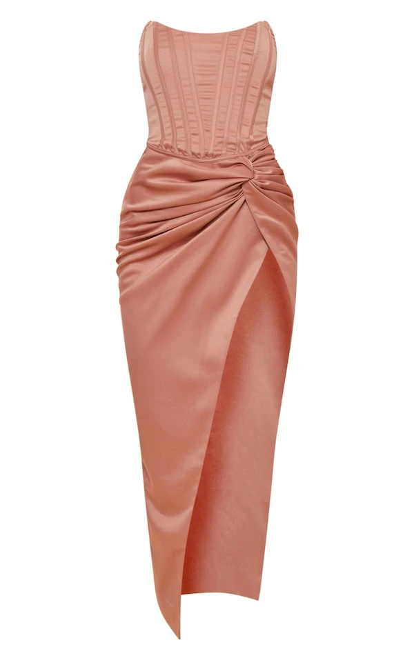 So glam cette robe longue ! On adore son coloris argile très flatteur, sa matière satinée magnifique et son design à corset et à torsade sur l’avant. Plus qu’à enfiler une paire de talons hauts et quelques bijoux gold. Trop belle !
