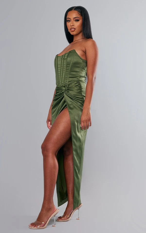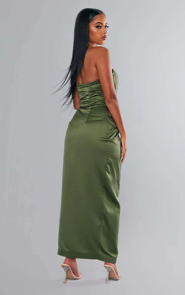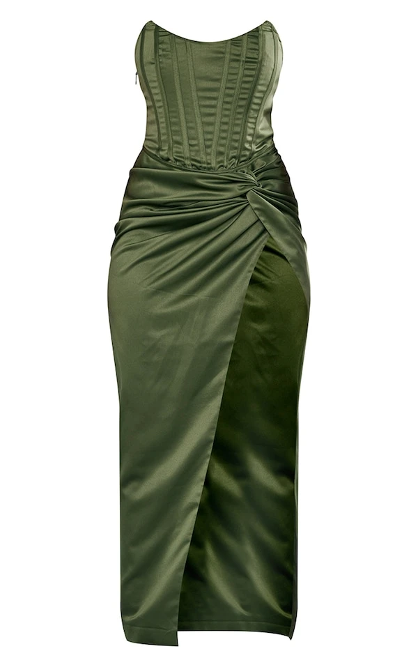 Label PLT Robe longue satinée froncée vert olive foncé à corset et torsade