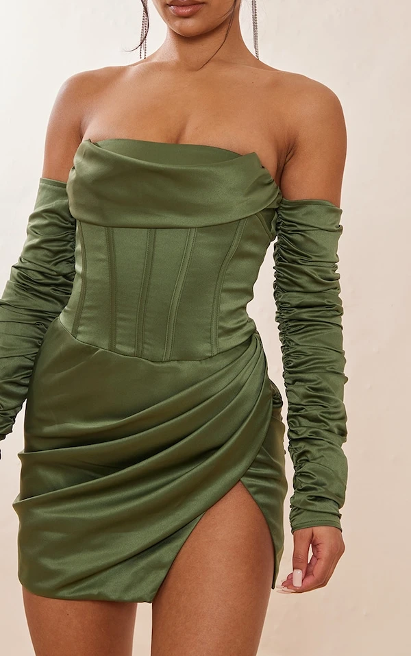 Label PLT Robe satinée sauge kaki à corset et manches froncées