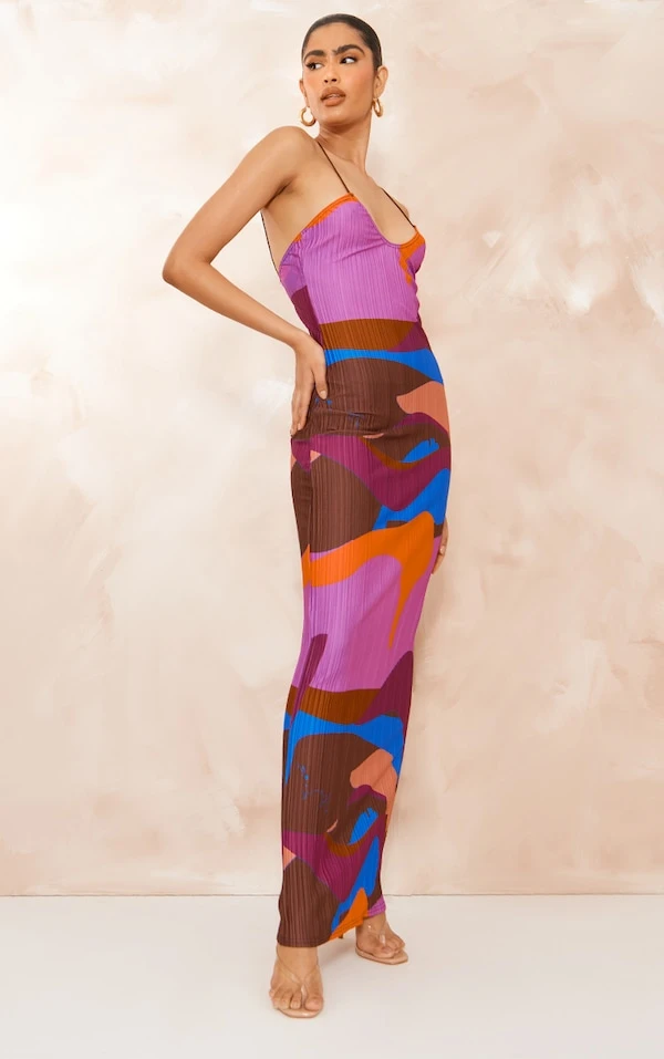 Robe longue rose imprimé abstrait plissée à bretelles et dos échancré