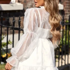 Robe Droite En Organza Blanc Ă Col Montant Et Manches Bouffantes
