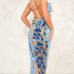 Robe Longue Fleurie Bleue Floquée à Col Bénitier Et Dos Ouvert