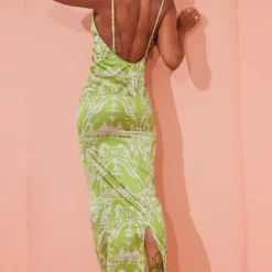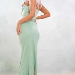 Robe Longue Satinée Vert Sauge à Col Bénitier Et Dos Nu Détail Lanière