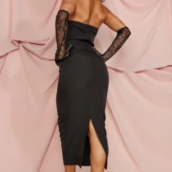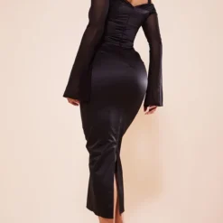 Robe Mi-longue Satinée Noire Détail Corset à Manches En Mesh Et épaules Dénudées