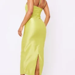 Robe Mi-longue Satinée Imprimé Renaissance Vert Citron à épaule Unique
