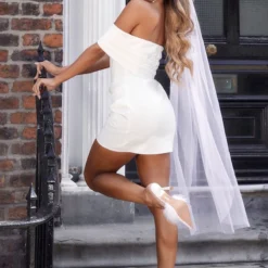 Robe Moulante Blanche Rose Appliquée à Col Bardot Et Détail Bonnets