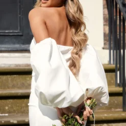 Robe Moulante Blanche Ă Manches Longues Bouffantes Et Col Bardot
