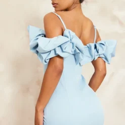 Robe Moulante Bleu Clair à Manches Bouffantes Et Corset Plissé