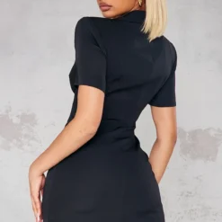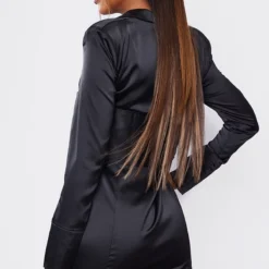 Robe Blazer Satinée Noire à Détail Buste Froncé Et Ourlet Volanté