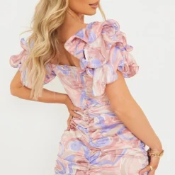 Robe Moulante Rose Fleurie Nouée Devant à Manches Bouffantes