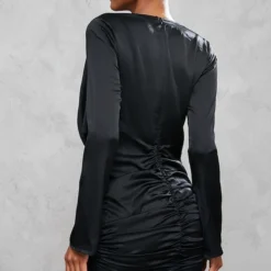 Robe Moulante Noire Satinée Froncée à Col Bénitier Plongeant Et Manches Longues