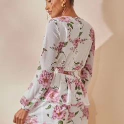 Robe Patineuse Blanche à Imprimé Floral En Mousseline De Soie Avec Décolleté Plongeant