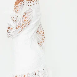 Robe Moulante Volantée Blanche à Col Haut Et Manches Longues En Dentelle