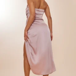 Robe Bustier Longue Vert Olive Satinée Découpée Sur Les Côtés