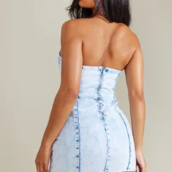 Robe Bustier Courte En Jean Bleu Clair Javélisé à Détail Coutures