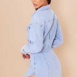 Robe En Jean Bleu Clair Délavé à Manches Longues Et Détail Coutures