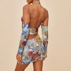 Robe Moulante Multicolore Imrpimé Collage Vintage à Dos Nu Noué