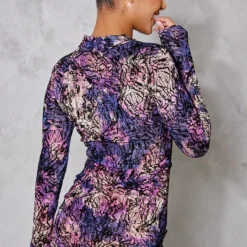 Robe Moulante En Mesh Floqué Multicolore à Détail Froncé Et Manches Longues