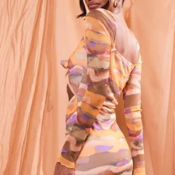 Robe Moulante En Mesh Imprimé Tourbillons Multicolores à Découpes Et Devant Noué