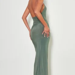Robe Longue Moulante Kaki Froncée à Col Montant Et Découpes