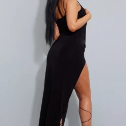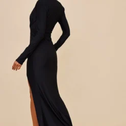 Robe Longue Moulante Découpée Noire à Taille Froncée Et Manches Longues