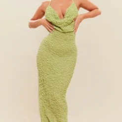 Robe Longue Texturée Vert Sauge à Col Bénitier Et Découpes Dans Le Dos