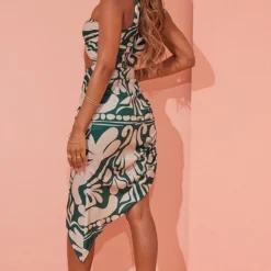 Robe Longue Asymétrique Vert Foncé Imprimé Abstrait à Découpes Et Dos Nu