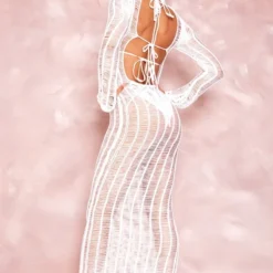 Robe Longue En Maille Tricot Luxe Café Au Lait Ouverte Dans Le Dos