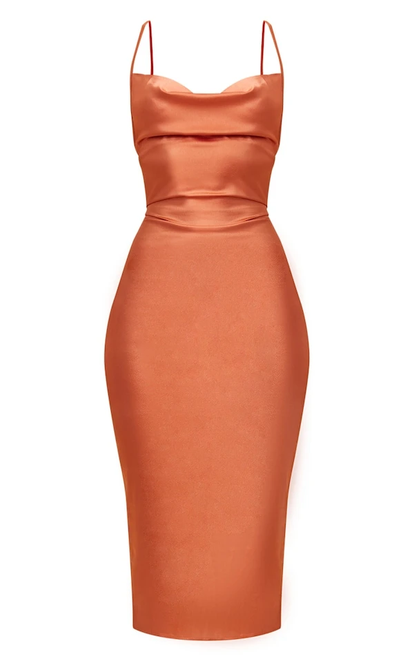 Robe mi-longue satinée rouille à lanières croisées au dos et col bénitier