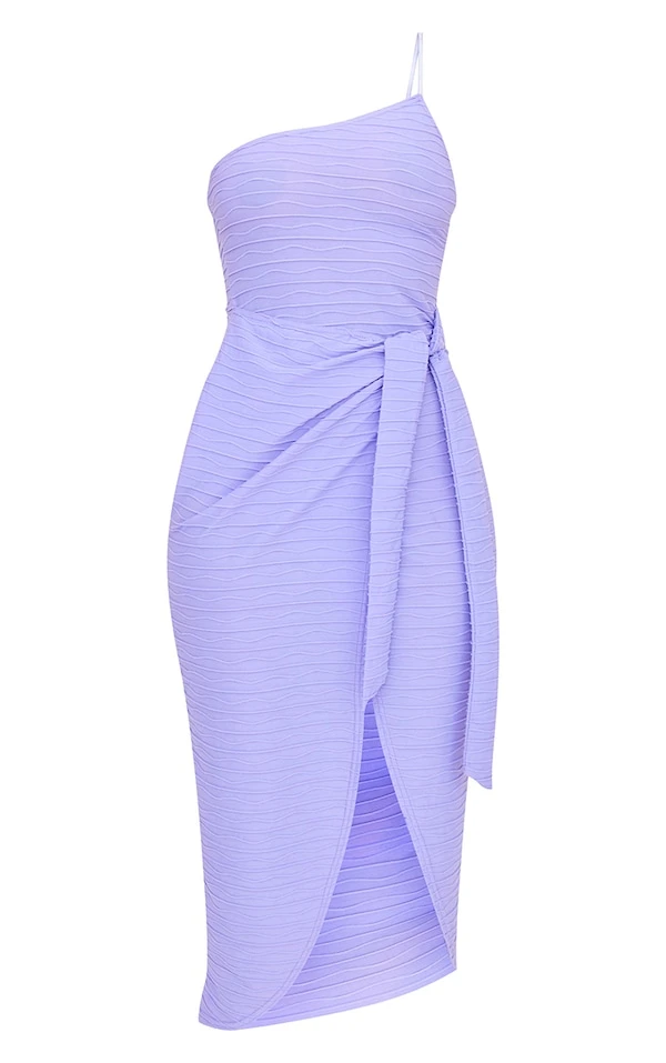 Robe asymétrique mi-longue texturée violette à jupe portefeuille