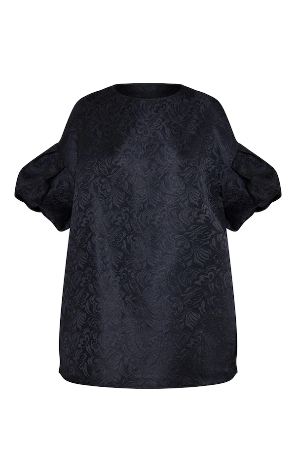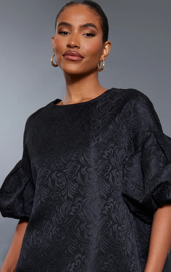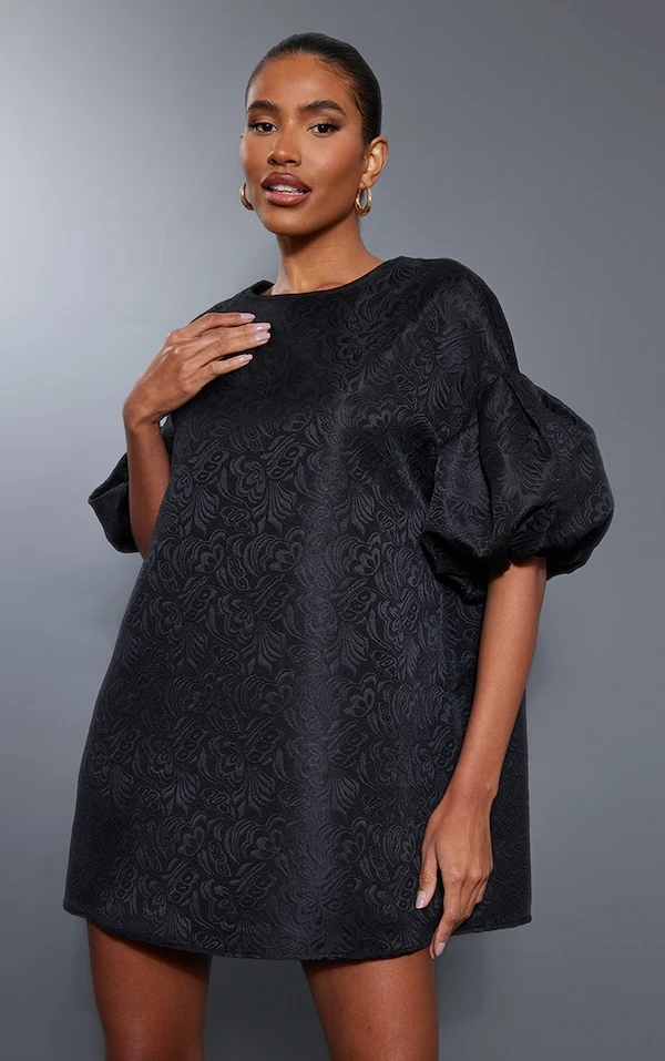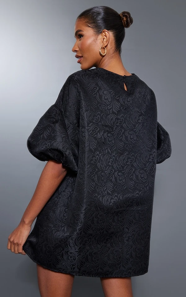 Robe babydoll noire en jacquard texturé à manches bouffantes