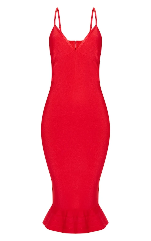 Robe bandage mi-longue rouge à fines bretelles et ourlet volanté