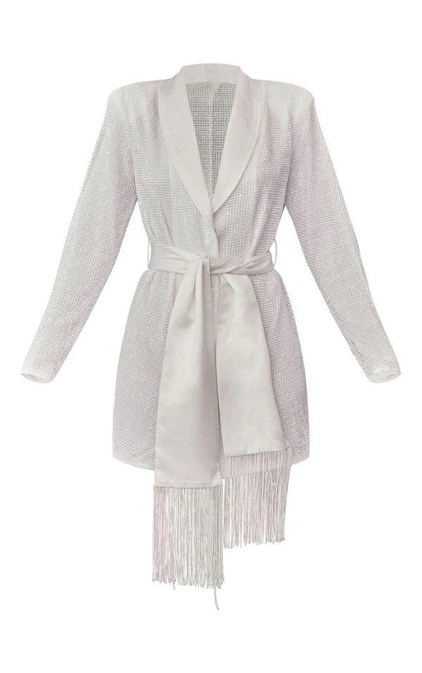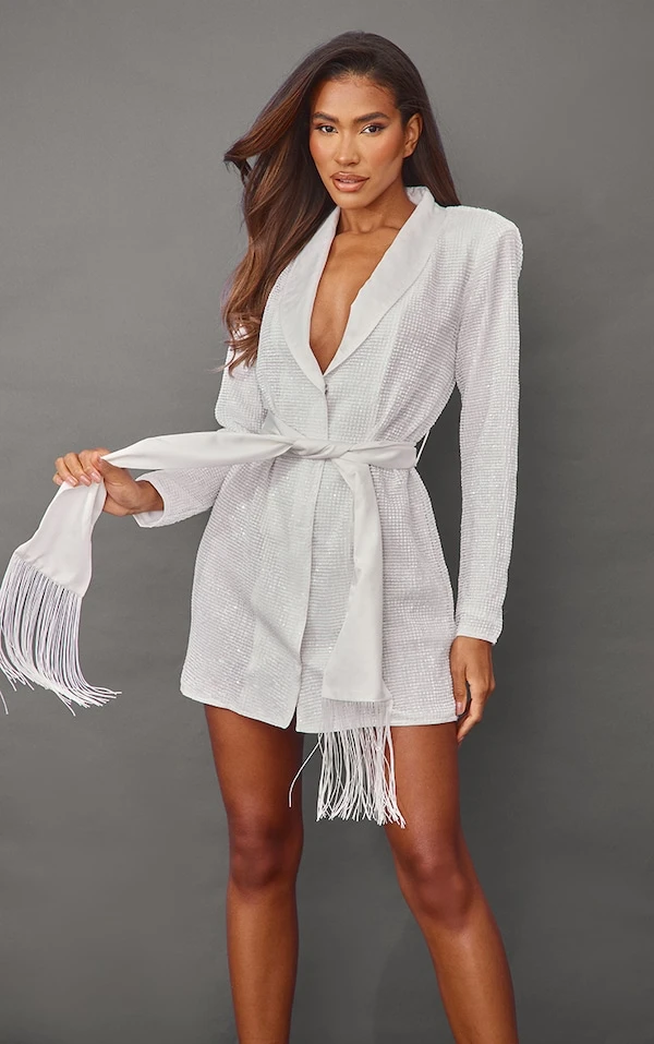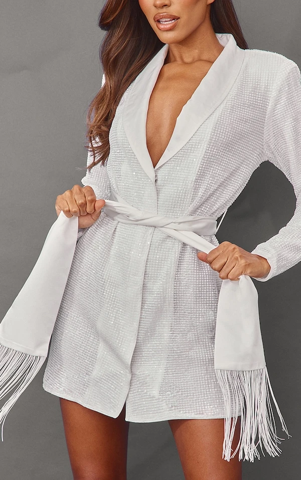 Impossible de ne pas vous remarquer dans cette robe babe ! On crush sur sa matière blanche à sequins, son détail noué et son style blazer intemporel. Avec des mules à talons et vos accessoires préférés, vous êtes la plus belle !