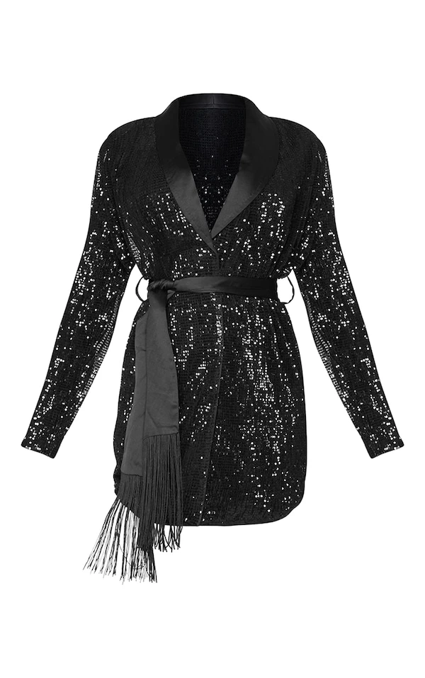 Robe blazer noire à sequins et franges détail noué
