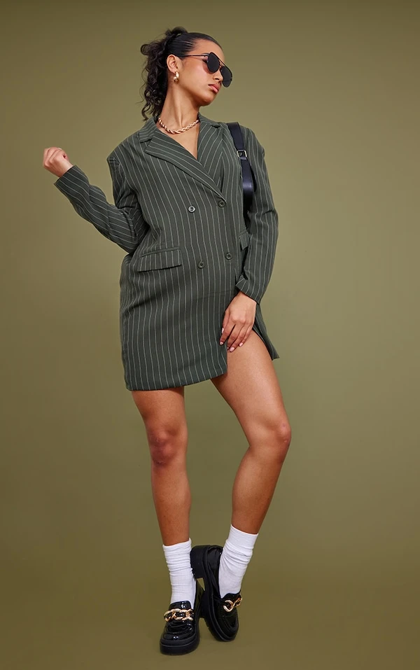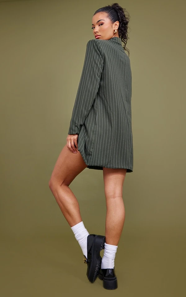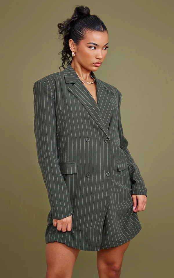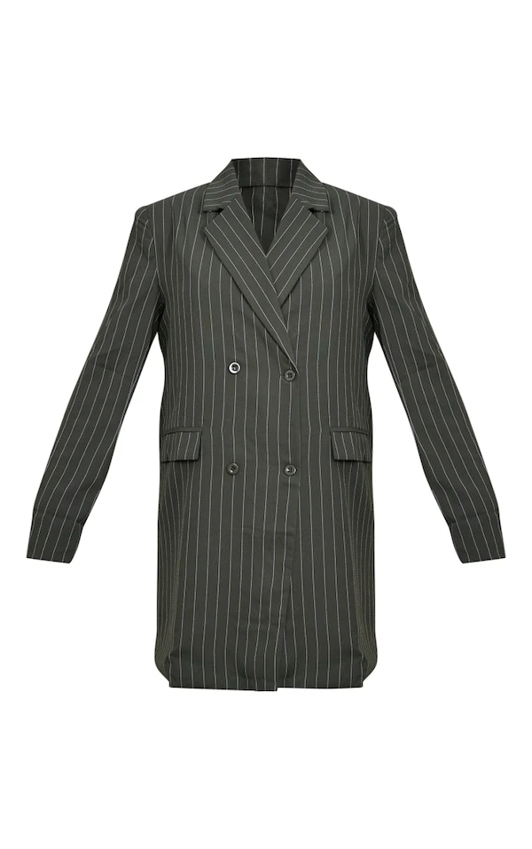 Robe blazer oversier kaki sauge à fines rayures et double boutonnière