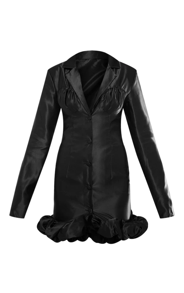 Robe blazer satinée noire à détail buste froncé et ourlet volanté