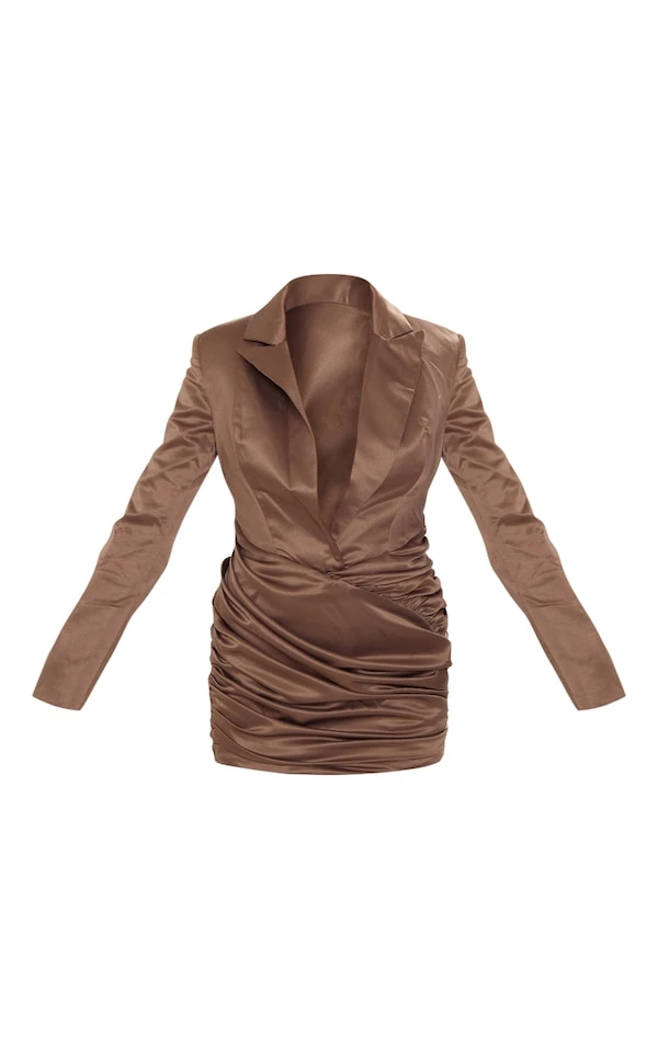 Robe blazer satinée taupe décolletée à jupe portefeuille