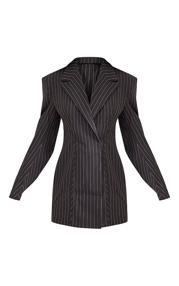 Robe blazer structurée tissée noire à fines rayures et taille cintrée