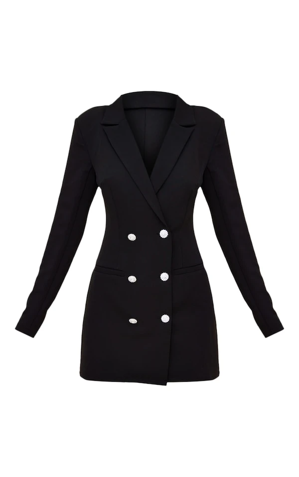 Robe blazer tissée noire à double boutonnière et boutons strassés