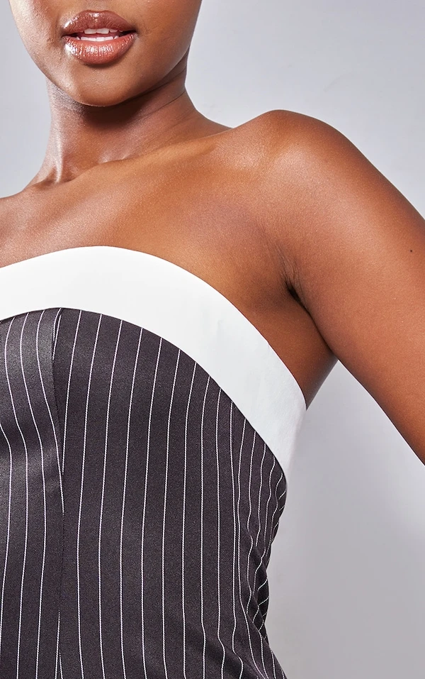 On adore le look années 60 de cette robe ! Avec sa matière noire à fines rayures et son design bustier, elle vous transforme en adorable pin-up avec des bottes montantes et un sac à main. In love !