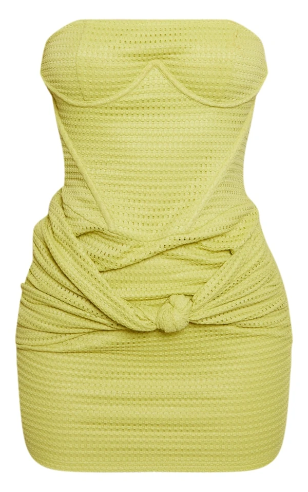 Robe bustier moulante texturée vert sauge drapée à noeud et armatures