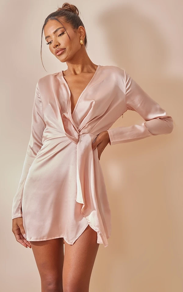 Gros crush pour cette robe cache-coeur en satin nude. Portez-la avec une paire de talons à bride et quelques accessoires pour un look on-point.