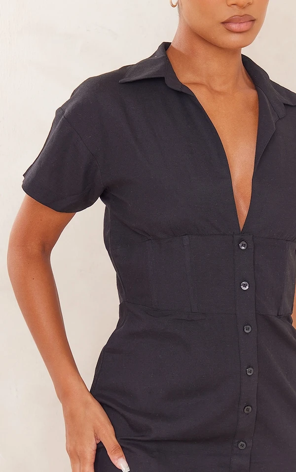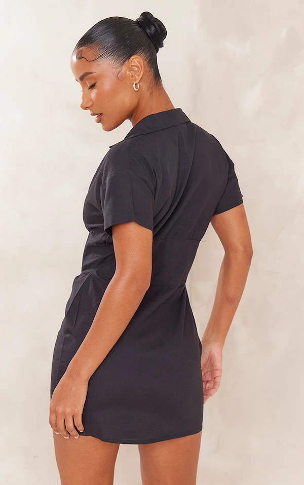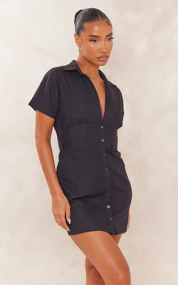 Robe chemise effet lin noir à manches courtes et taille cintrée