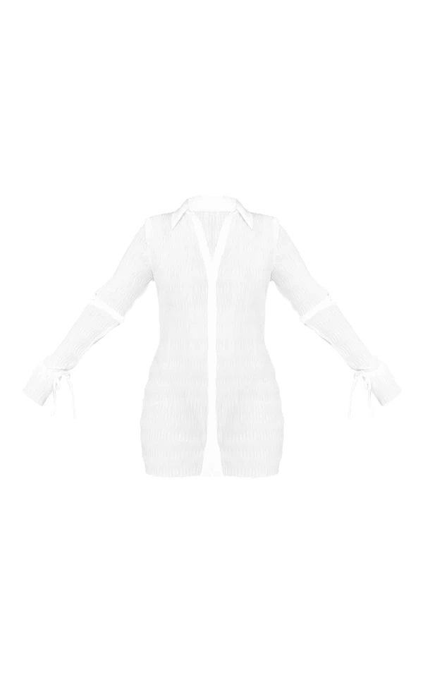 Robe chemise en mousseline de soie blanche texturée transparente à manchettes évasées
