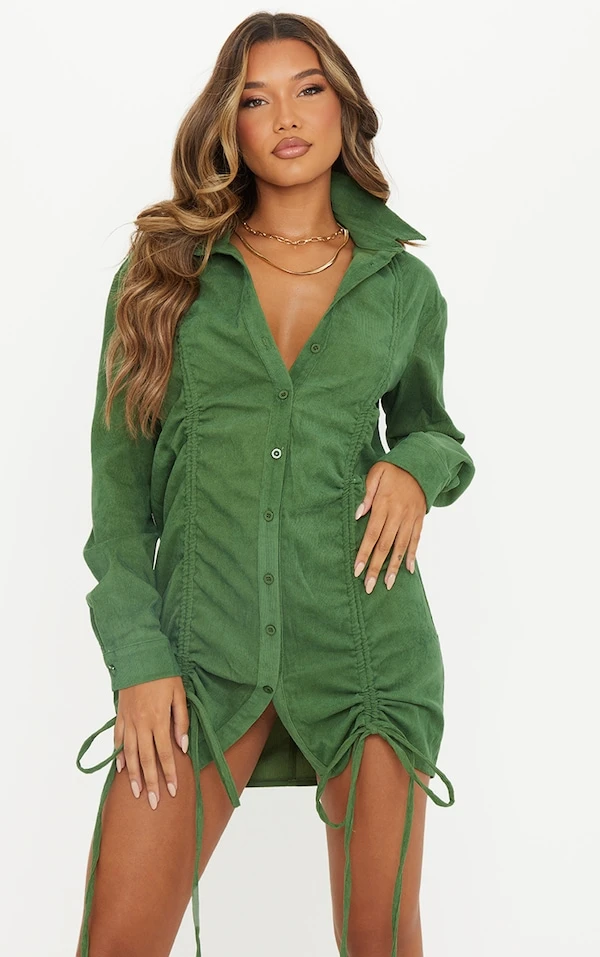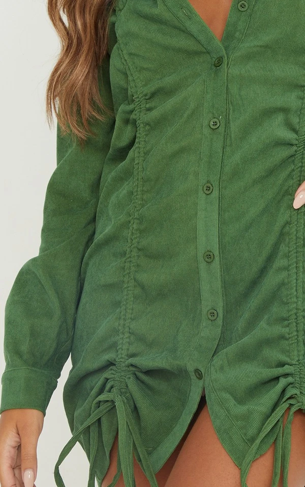 Robe chemise en velours côtelé kaki doublement froncée