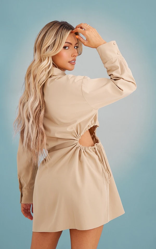 Robe chemise gris pierre à taille froncée et découpée