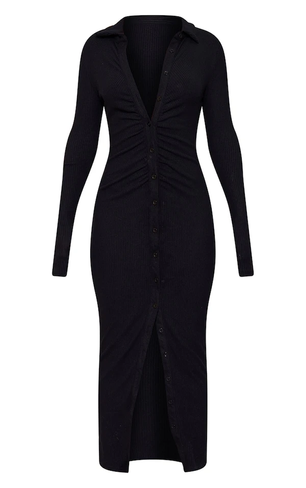 Robe chemise longue côtelée brossée noire à fronces et manches longues