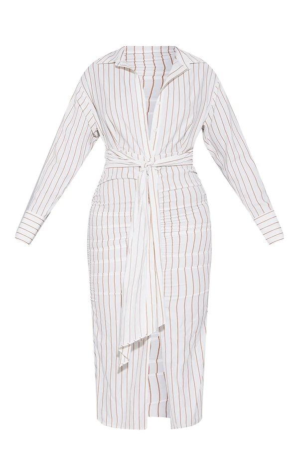 Robe chemise mi-longue blanche rayée à taille nouée et jupe froncée