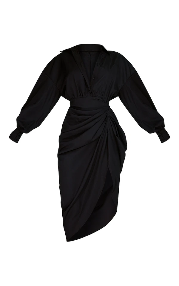 Robe chemise mi-longue noire à manches ballon et jupe froncée