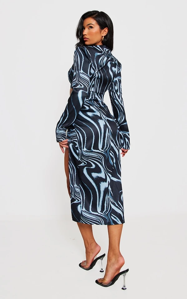 Robe chemise mi-longue satinée tissée imprimé tourbillons zébrés noir & blanc et découpes